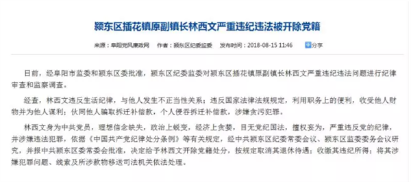 日前,经阜阳市监委和颍东区委批准,颍东区纪委监委对颍东区插花镇原副镇长林西文严重违纪违法问题进行纪律审查和监察调查。经查,林西文违反生活纪律,与他人发生不正当性关系;违反国家法律法规规定,利用职务上的